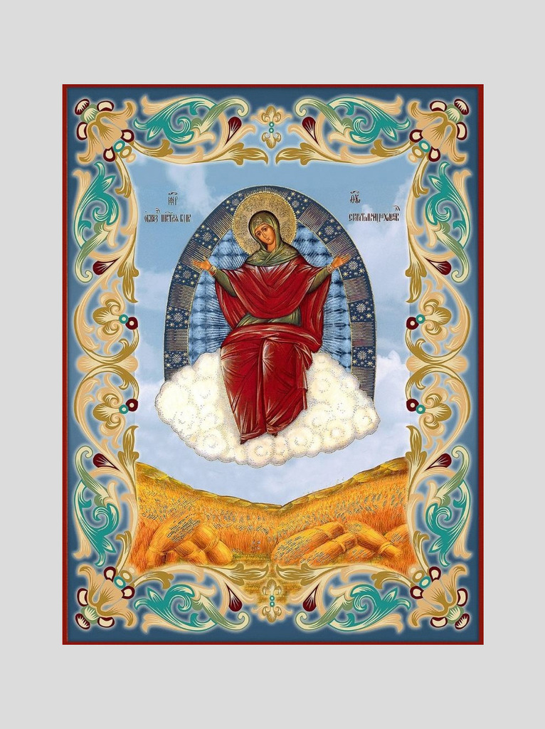 Пресвятая Богородица восседает на облаках с вознесёнными открытыми ладонями в разные стороны. Она благословляет ржаное поле и собранные снопы колосьев.