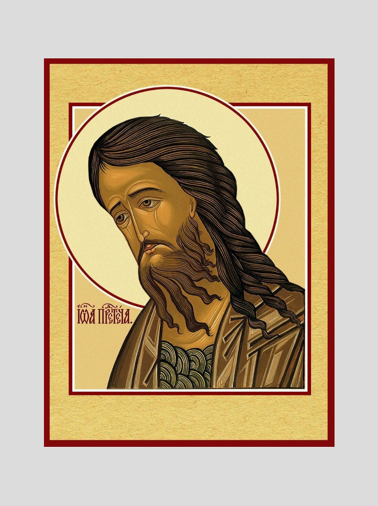 Святого Иоанна Предтечу изображают в виде мужчины средних лет с коричневыми или темно-коричневыми вьющимися запутанными волосами и короткой кудрявой бородой. Несмотря на возраст, его изображают уже с морщинами. Одет он в соответствующую его жизни одежду — власяницу и плащ.