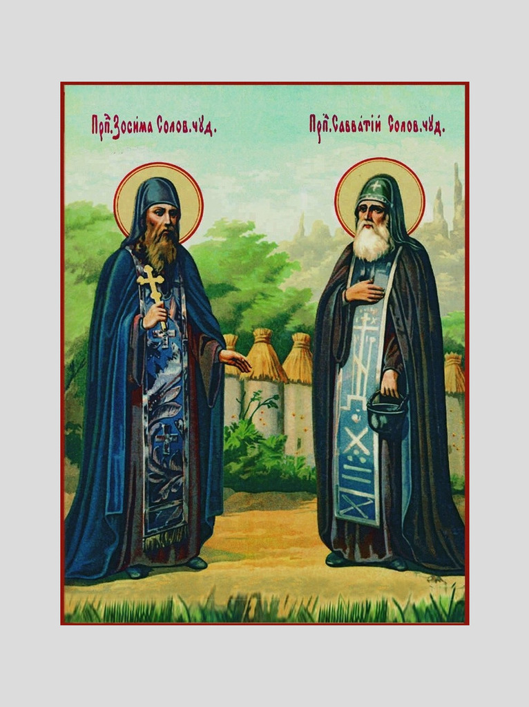 Святой Зосима родился близ Новгорода в благочестивой христианской семье Гавриила и Варвары. После смерти родителей юноша раздал все имущество, принял монашеский постриг и отправился на север к побережью Белого моря, где встретил святого Германа. Впоследствии, в 1436 году, они вдвоем отправились на необитаемый остров, где святому Зосиме было видение храма, который стоял на облаках. Так они поняли, что Господу угодно, чтобы на том месте была основана святая обитель.